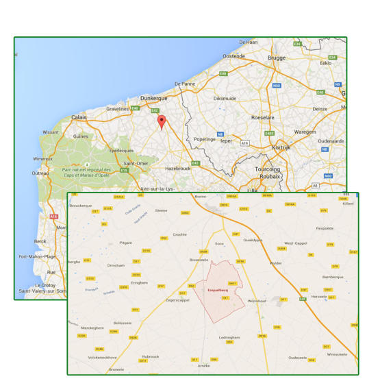 Esquelbecq est situé à 24,8 km de Dunkerque, 60 km de Lille et à 16,7 km d’Oost-Cappel sur la frontière belge et à 60 km des côtes anglaises
